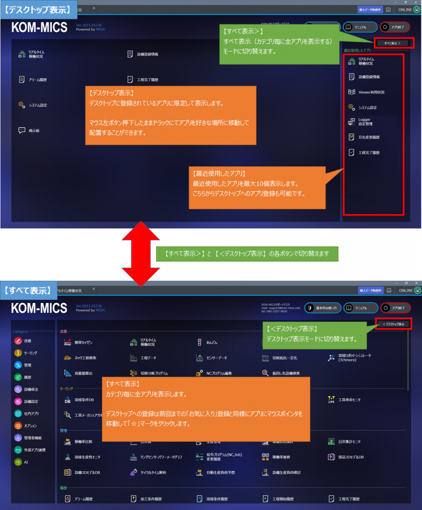 右端の「すべて表示」及び「デスクトップ表示」にて通常のアプリ一覧とお気に入り登録したデスクトップ表示を切り替えることが可能です。