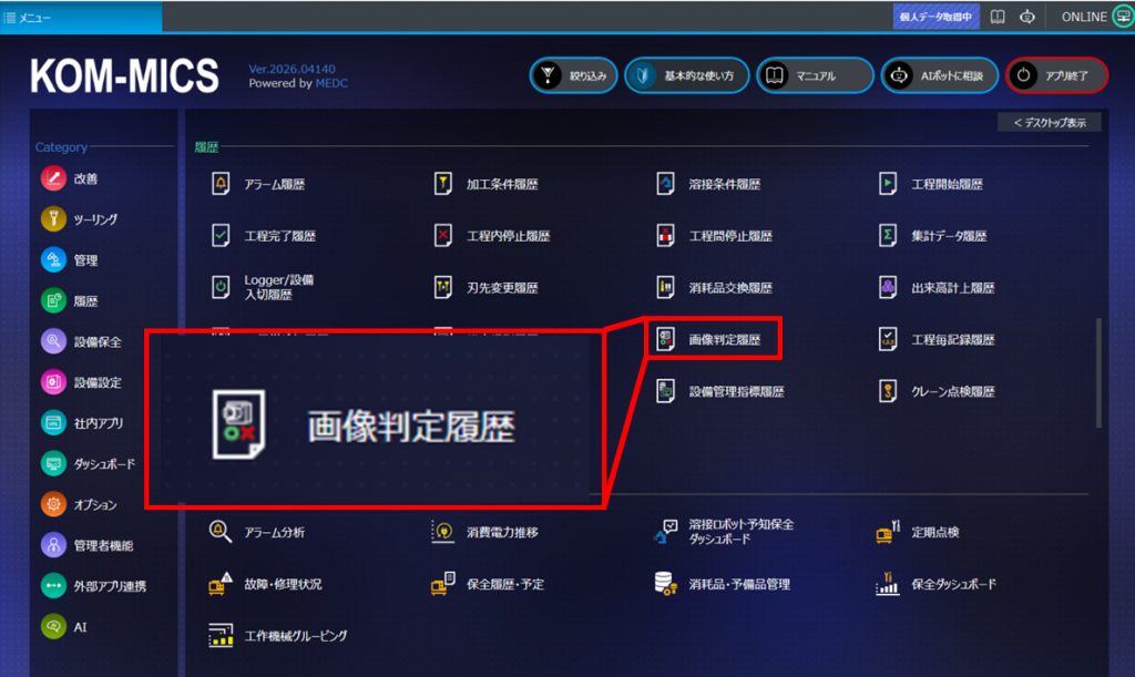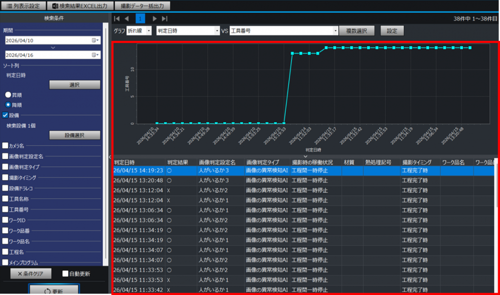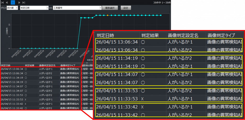 履歴カテゴリの「画像判定履歴」アプリでは、工作機械やPLC設備に設置したカメラで撮影した画像の履歴を検索し、閲覧できます。