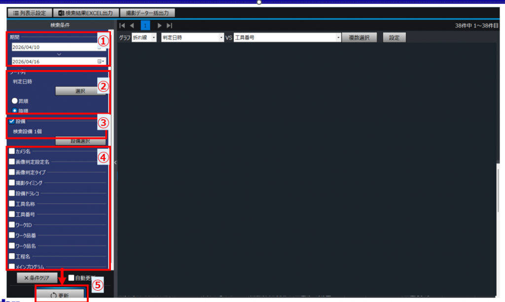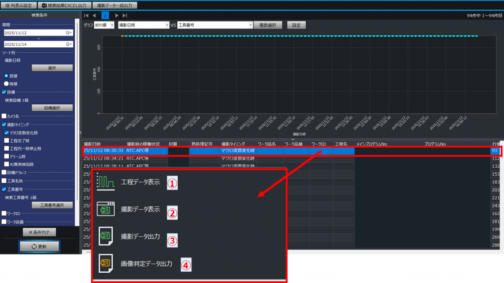 ④必要な場合はカメラ名、撮影タイミング、工具番号、ワーク品番、メインプログラムなどを絞り込みチェックボタンをチェック後、ボタンをクリック