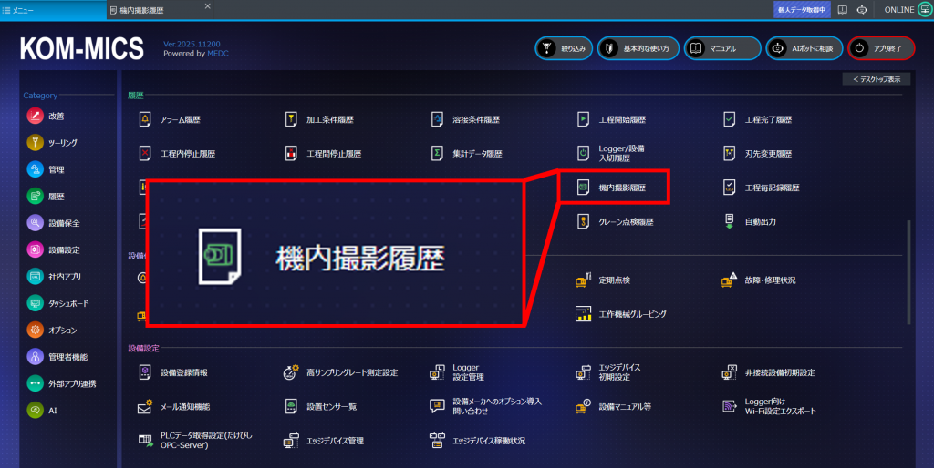 履歴カテゴリの「機内撮影履歴」アプリでは、機内カメラによる撮影の履歴を検索できます。撮影データ(画像)の表示や出力、撮影データに対して画像処理やAIを適用した結果の検索や出力にも対応しています。また、Excel形式での出力にも対応しています。