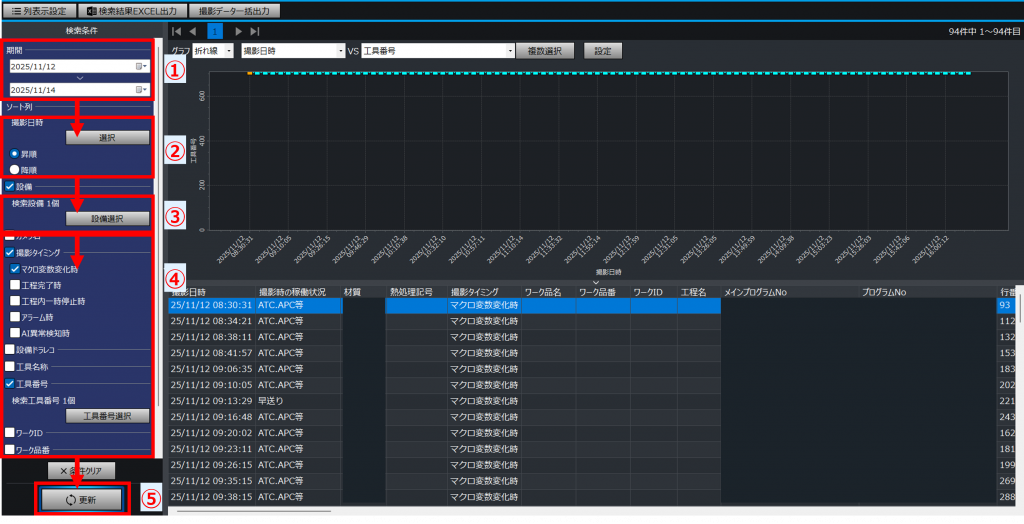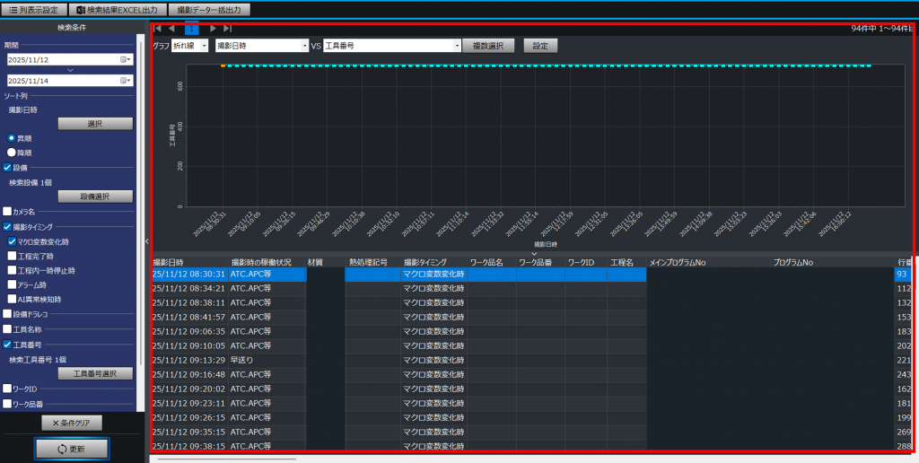 ④必要な場合はカメラ名、撮影タイミング、工具番号、ワーク品番、メインプログラムなどを絞り込みチェックボタンをチェック後、ボタンをクリック。
